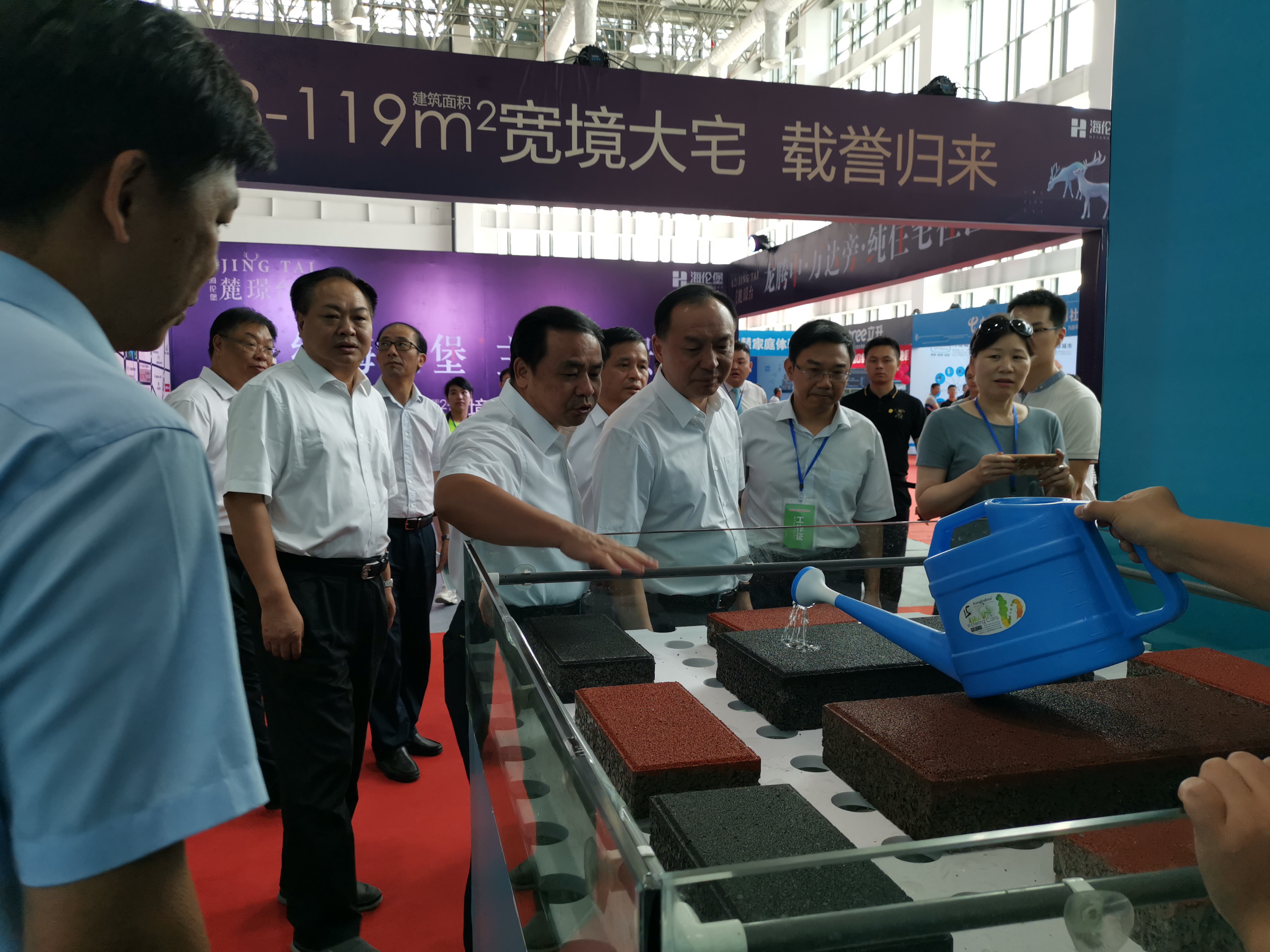 8月16日—18日,龍巖天潤龍城新型建材有限公司參加龍巖市建筑產業發展大會建筑新型材料展,展會上公司發放了公司產品宣傳冊,播放公司產品宣傳片,擺放公司產品樣品并在現場進行透水效果演示,市委許維澤書記一行在巡視展館中饒有興致地觀看聽取了公司產品性能情況介紹,對透水建材產品贊譽有加。