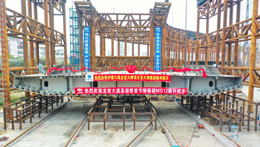 2019年12月31日上午9:28,龍巖大橋主橋首片鋼箱梁開始吊裝,標(biāo)志著龍巖大橋主橋正式進(jìn)入鋼箱梁施工階段。首片鋼箱梁提升、滑移、頂推共歷時(shí)約8小時(shí)完成,整個(gè)主橋結(jié)構(gòu)共有26片鋼箱梁。